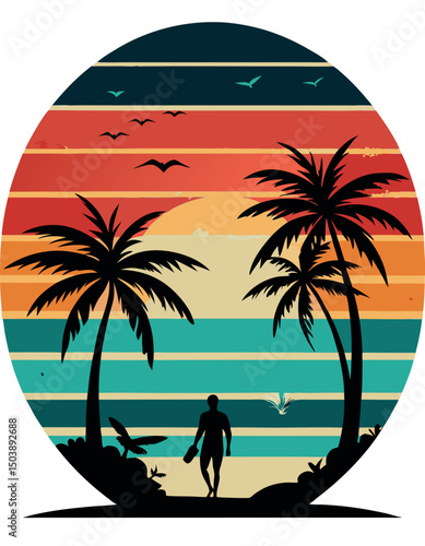 Retro Sunset Beach Vector with Palm Trees, Silhouette of Man Walking, and Seagulls – Tropical Vintage Design for T-Shirts, Posters, and Travel Art