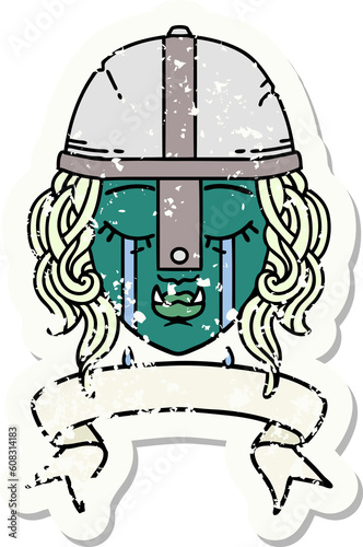 warrior, fighter, soldier, goblin, half, monster, woman, female, girl, race, class, sad, upset, crying, scroll, banner, dragon, game, art, illustration, signs, symbol, drawing, tattoo, retro, style, artwork, icon