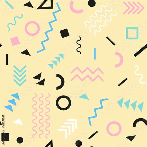 Retro vintage 80s or 90s fashion style. Memphis seamless pattern. Trendy geometric elements. Modern abstract design. Good for textile fabric. Vector illustration.