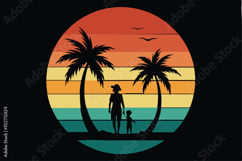 Retro vintage style sunset, palm tree, Adobe Illustrator illustration, 16k, with sunset style and mom and son silhouette, T - shirt design, T - shirt graphic, retro vintage style circle., illustration
