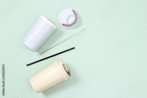 hot drink, cup, cardboard box, reusing, metal, straw, container, reuse, zero, waste, drink, bamboo, beverage, take out, paper, stainless, ecology, disposable, top, view, creative, overhead, trend, copy space, no, plastic, concept, mug, recyclable, hot, cappuccino, big, delivery, mock-up, to do, drinking