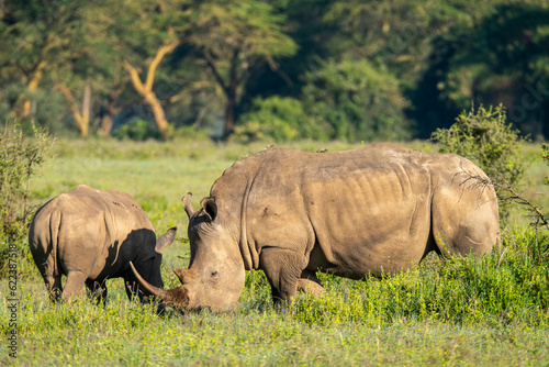 Rhino grazing in pasture in daylight