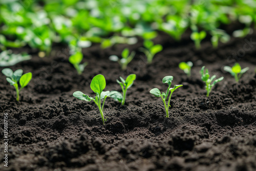 Rich dark soil nurtures new crop seedlings sprouting, promising fertile growth and agricultural prosperity remarkably