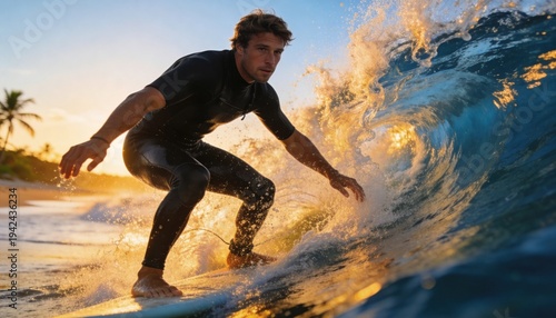 Riding the Tide: A surfer skillfully carves a wave, illuminated by the radiant glow of the setting sun, capturing the essence of the ocean's energy and the thrill of the ride.