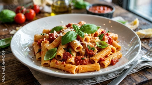 Rigatoni pomodoro sauce in white ceramic plate garnished with fresh basil leaves and grated Parmesan cheese on rustic wooden table with ingredients in background