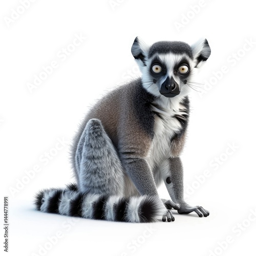 three-dimensional, sticker, cute, rendering, lemur, primate, mammal, animal, wildlife, zoology, nature, fauna, rainforest, forest, africa, madagascar, sitting, seated, pose, portrait, isolated, studio, photo, image, digital, graphic, design, grey, white, black, fur, tail, eye, face, adorable, mammalian, closeup, conservation, endangered, species, exotic, beautiful