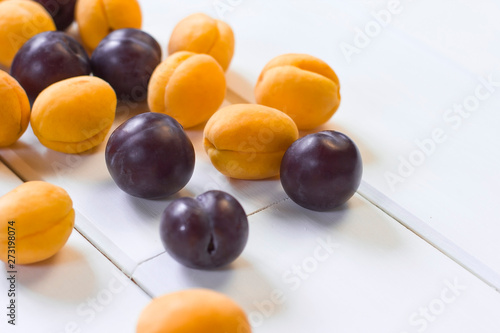 ripe plums and apricots on a white wooden background