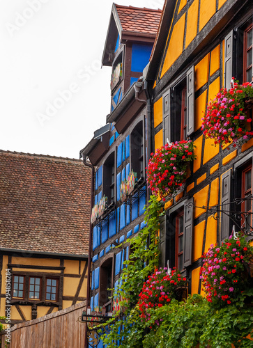 Riquewihr in Alsace, France. Enchanting medieval village, along the wine road that connects Colmar to Strasbourg. View of the old village within the walls.