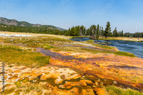 River bank near hot springs with yellow edges, Yellowstone National Park, USA