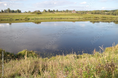water, lake, landscape, nature, sky, river, summer, green, grass, blue, duck pond, tree, wetland, swamp, field, marsh, cloud, panorama, forest, view, cloud, scenic, meadow, background, beautiful, beauty, boat, calm, countryside, day, environment, natural, outdoors, river bank, rural