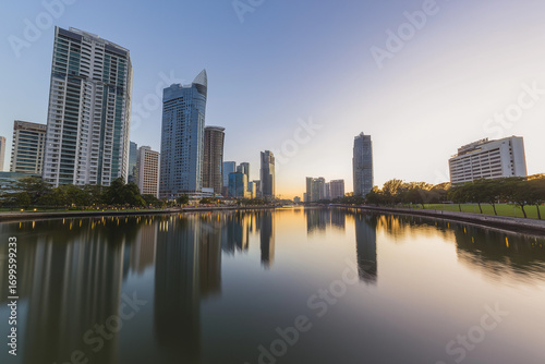 Riverside cityscape at dusk with reflections of skyscrapers in calm water, soft evening light, tranquil urban scenery.
