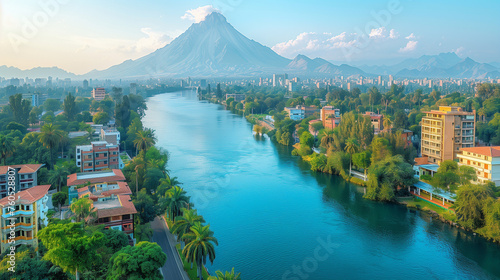 city landscape, volcano, river, palm tree, tropical, urban, mountain, skyline, nature, scenic, waterfront, architecture, residential area, travel, tour tourism, panorama, exotic, vibrant, daytime, water, building, housing, serene, outdoors, natural beauty, downtown, landscape, calmness, aerial view, lush, greenery, waterway, environment, river bank, riverside