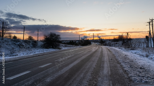 road, winter, sky, highway, sunset, snow, landscape, travel, nature, sun, car, way, sunrise, horizon, asphalt, rural, cold, cloud, country, tree, street, blue, lane
