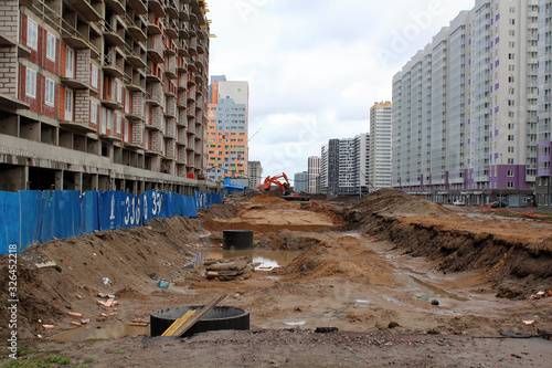 Road. Mountains of sand. Two excavators dig a hole. Around you can see multi-story buildings.