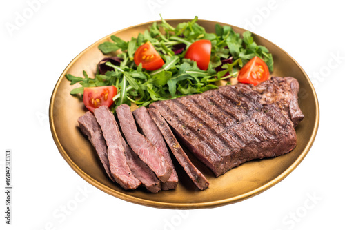 Roast dry aged Top Sirloin beef steak on plate with salad isolated on white background