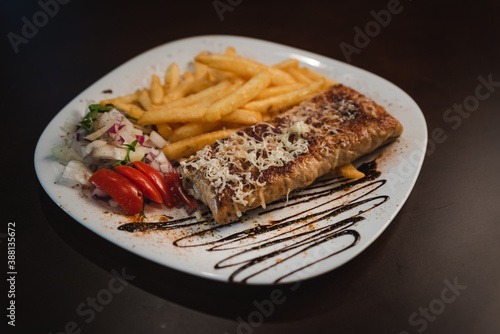roast meat with cheese and salad on a plate and salad on a plate