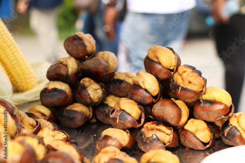 Roasted chestnuts on the street. Street food. fried chestnuts. selective focus
