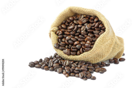 Roasted coffee beans in burlap sack on white background.