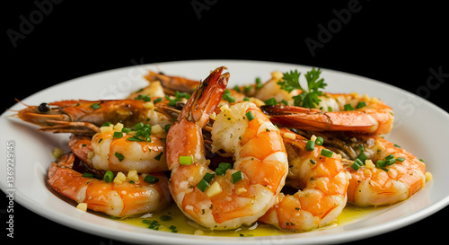 shrimp, seafood, grilled, cooked, food, plate, delicious, dinner, eatery, tasty, meal, dish, garlic, herb, parsley, orange, brown, white, closeup, photo, butter, fresh