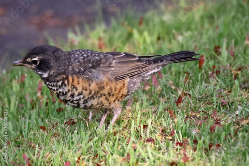 Robin mother trying to feed three almost full grown fledged chicks in back yard in evening light in spring