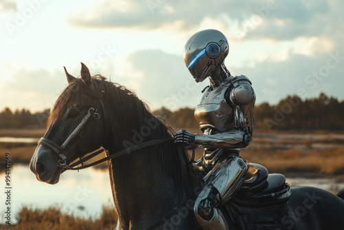 robot, horse, water, landscape, sunset, calmness, serene, natural, cybernetic, equestrian, future, machinery, mechanical, peaceful, calm, journey, adventure, connection, nature, technology, science fiction, science fiction, sleek, modern, lake, surreal, steed, equine, harmony, innovation, exploration, travel, photorealistic, interface, meadow, pasture, scenic, shiny, dawn, modernity