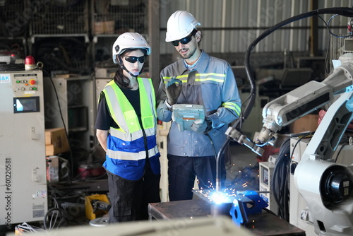Robotics engineer working on maintenance of robotic arm in factory warehouse. Business technology.