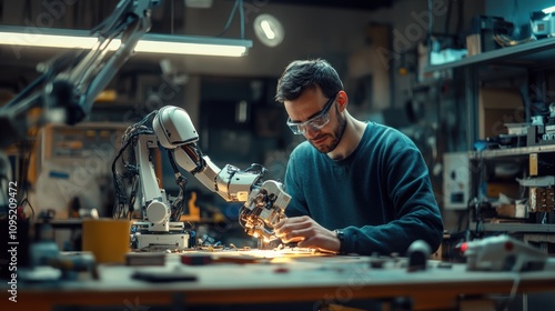 Robotics Engineer Works with Advanced Robotic Arm in Workshop