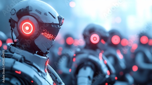 robot, robot, android, cyborg, futuristic, future, city, city landscape, urban, scene, technology, technically, science, fiction, science fiction, artificial, intelligence, ai, machine, machine, army, military, soldier, squad, line, formation, standing, group, crowd, digital, artwork, rendering, three-dimensional, model, digital artwork, illustration, image, concept, art, design, background, light, red, blue, white, grey