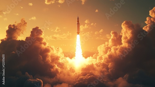 Rocket launch at sunset, clouds, space exploration