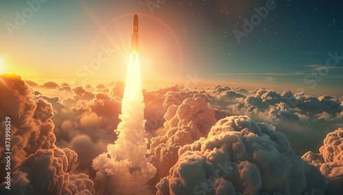 rocket, launch, sunrise, cloud, sky, space, flight, ascent, mission, exploration, atmosphere, fire, smoke, trail, bright, orange, yellow, gold, blue, white, light, star, dawn, morning, horizon, power, energy, speed, dynamic, upward, motion, travel, future, progress, technology, science