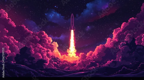 rocket, launch, space, night, sky, cloud, pink, purple, star, cosmos, galaxy, nebula, fire, flames, smoke, explosion, bright, vibrant, colourful, majestic, powerful, energy, speed, flight, ascension, journey, adventure, exploration, future, technology, science, progress, ambition, dream, hope, success, innovation, dynamic, dramatic, awe, wonder, immensity, immensity