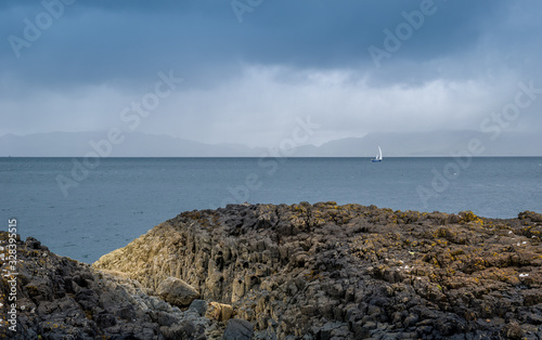 Rocks, sea and sailing boat scottish landscape. Tobermory, Island of Mull, Scotland.