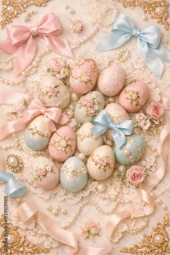 Rococo Easter Eggs Flat Lay with Vintage Lace Pearls and Pastel Decorations