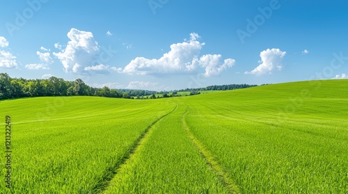 field, green, landscape, rolling, hill, sunny, sky, cloud, nature, farm, countryside, grass, summer, agriculture, rural, wheat, barley, scenic, beautiful, view, pasture, meadow, travel, serenity, tranquil, calm, peaceful, idylli, vibrant, bright, fresh, growth, ecology, environment, organic, farmland, land, background, image, photo, picture