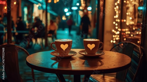 Romantic Evening with Heart-Shaped Lattes in Cozy Cafe Setting