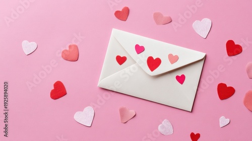 Romantic love theme for Valentines Day. A white envelope adorned with red heartshaped stickers on a vibrant pink background, creating a cheerful and romantic atmosphere.