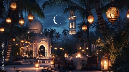 ramadan, dinner, romantic, mosque, night, palm, crescent, moon, arabian, luxury, islam, holiday, feast, celebration, table, chair, light, lantern, tropical, exotic, travel, vacation, food, eatery, elegant, spiritual, faith, peace, culture, tradition, religion, desert, oasis, sunset, evening, star, sky, water, paradise, zen, serene, calm, relaxing, ambience, atmosphere