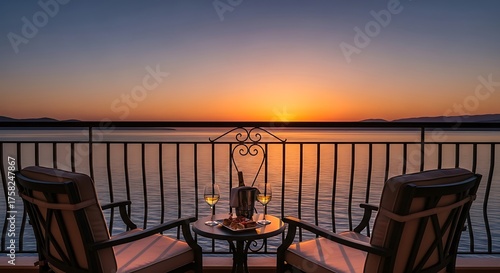sunset, balcony, romantic, water, chair, wine, view, evening, relaxation, luxury, gold, hours, serene, tranquil, vacation, travel, resort, hotel, scenic, peaceful, drink, lake, sea, horizon, beautiful, get-away, destination, twilight, landscape, chair, table, sky, sun, sunrise, holiday, nature, relax