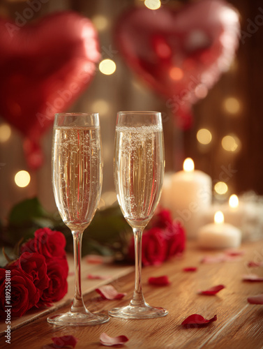 valentine, february 14, sparkling wine, toast, couple, romance, love, candle, candlelight, candle, rose, red rose, rose petal, heart, balloon, bokeh, lichterkette, warm light, cosy, elegant, luxury, table setting, eatery, intimate, special occasion, greeting card, copy space, closeup