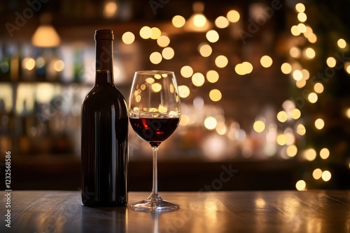 Romantic Wine Night: Red Wine Bottle and Glass on a Table with Warm Bokeh Lights