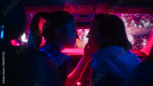 car, commute, transport, transportation, vehicle, passenger, driver, date, kiss, rain, night, evening, inside, tender, street, city, urban, neon light, pink, meeting, passion, lesbian, gay, girlfriend, couple, diversity, family, together, friends, partner, leisure, love, queer, human relationships, happy, woman, female, beautiful, attractive, young adult, portrait, people, feminine, feminism