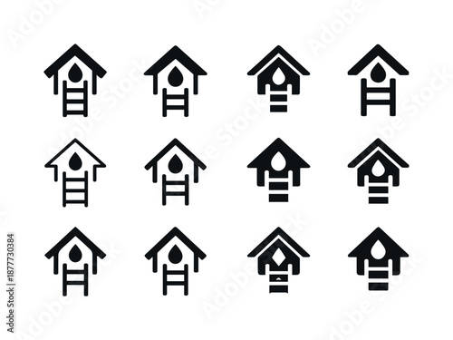 Roof Repair Icons. Fixing roof leaks. Icon set. Set Logo of Fixing roof leaks: Ladder: Negative space, Flat solid, Abstract geometric, Filled silhouette,