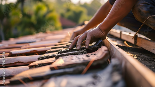 Roofer's Hands Installing Clay Tiles on House Roof at Sunset