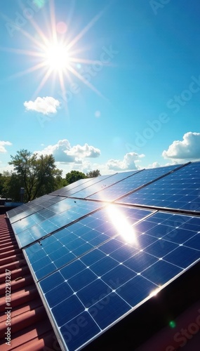 Rooftop solar panels gleam under a vibrant blue sky , home, panels