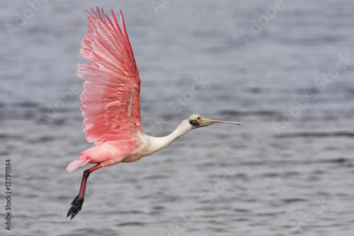 Roseate spoonbill (Platalea ajaja) flying, Ding Darling NWR, Florida, USA