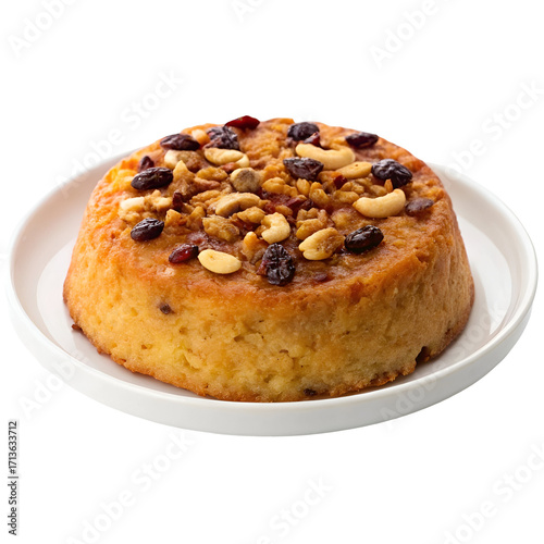 Round cake topped with nuts and dried cranberries on a white plate cashews walnuts