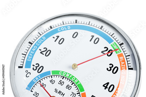 Round mechanical hygrometer on white background, closeup. Meteorological tool