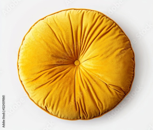 cushion, pillow, round, yellow, mustard, velvet, soft, plush, home, decor, textile, fabric, comfort, cosy, interior, design, furniture, accent, style, room, living, bedchamber, seating, circular, tufted, buttons, detail, texture, gold, ocher, autumn, fall, luxury, elegant, sophisticated, contemporary, modern, vintage, retro, bohemian, hand-made, craft, product, object, shape, colours