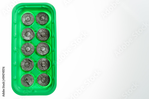 Round peat moss pellets for seedlings on green plastic tray,isolated on white