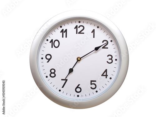 Round Silver Wall Clock Showing 07:10 or 19:10 Isolated-White. Useful for concepts like noon, midnight, deadline, countdown, or time management.